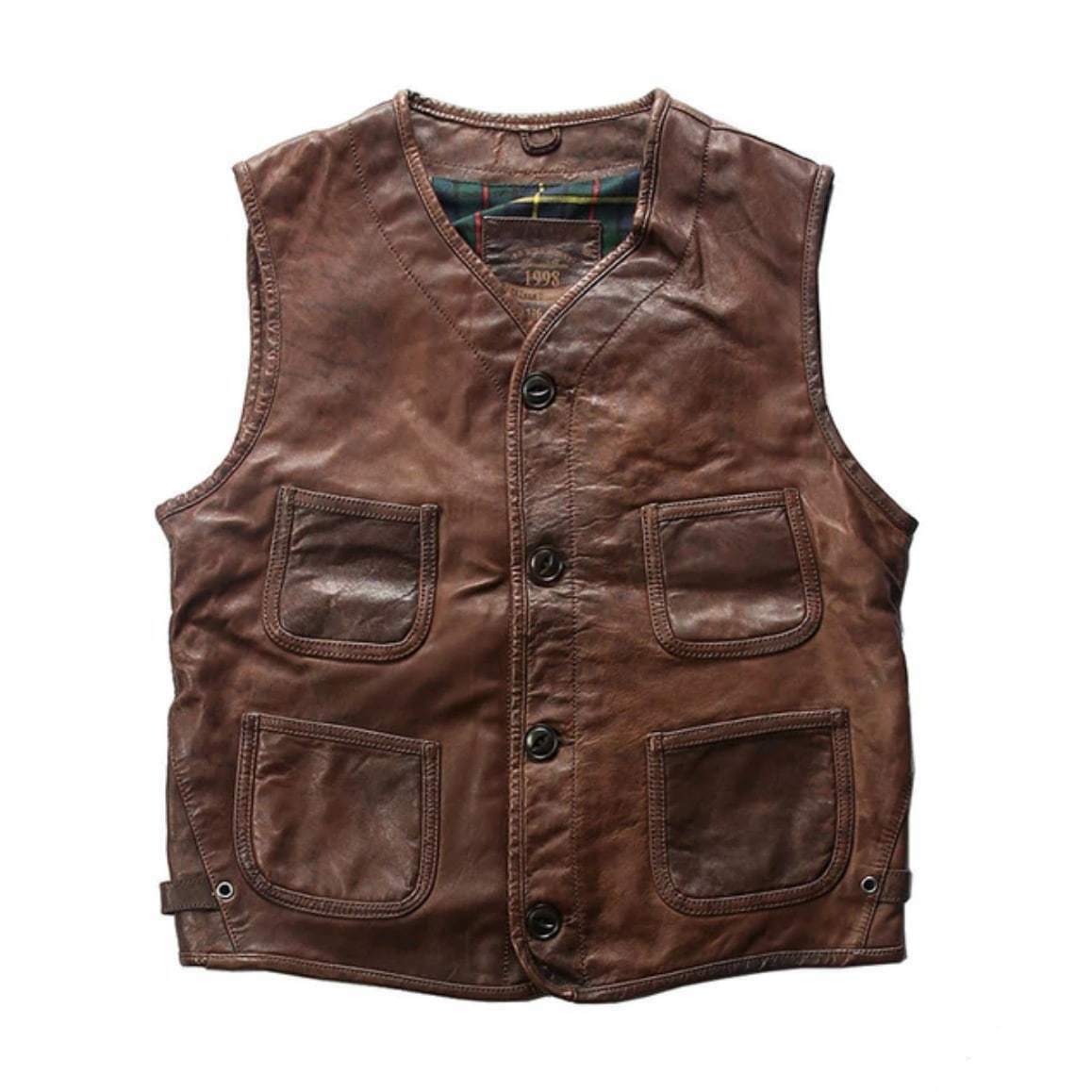 Kombinera elegans med livsstil med den här lädercowboyvästen, en extraordinär pjäs designad speciellt för män. Komplettera din väst med en fickursklocka för en komplett cowboylook.