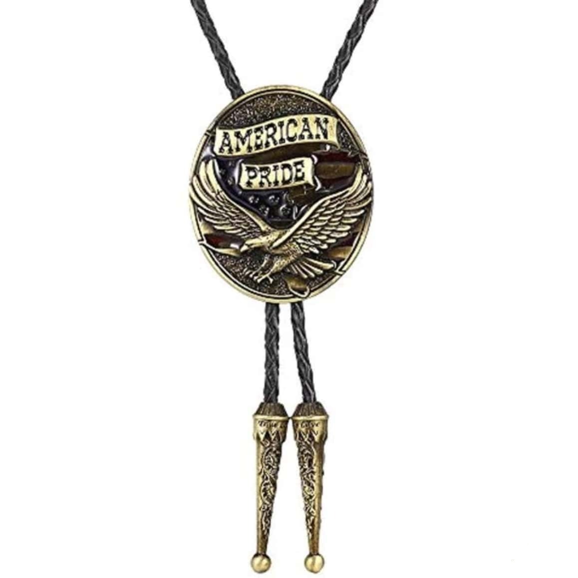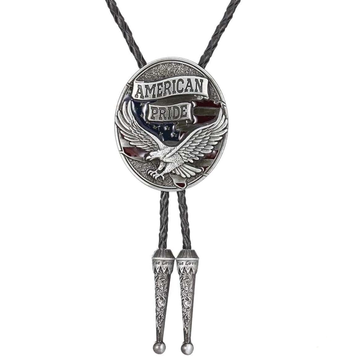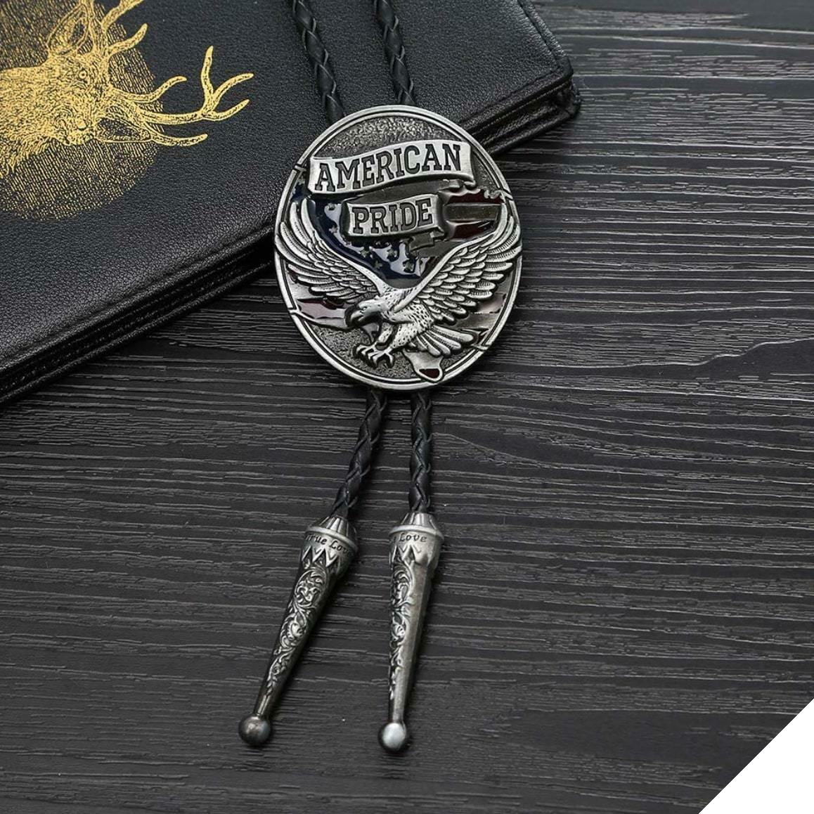 Bolo tie amerikansk slips framhäver med stolthet och elegans den amerikanska Vilda Västern, genom att inkludera både USA:s flagga och den kungliga örnen. Med sina detaljerade och sofistikerade detaljer ger den en subtil touch till din stil.