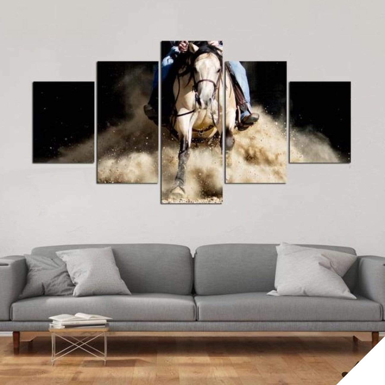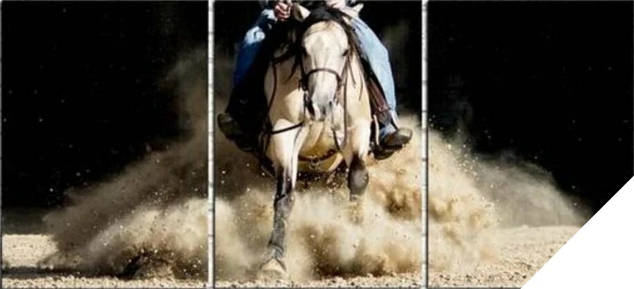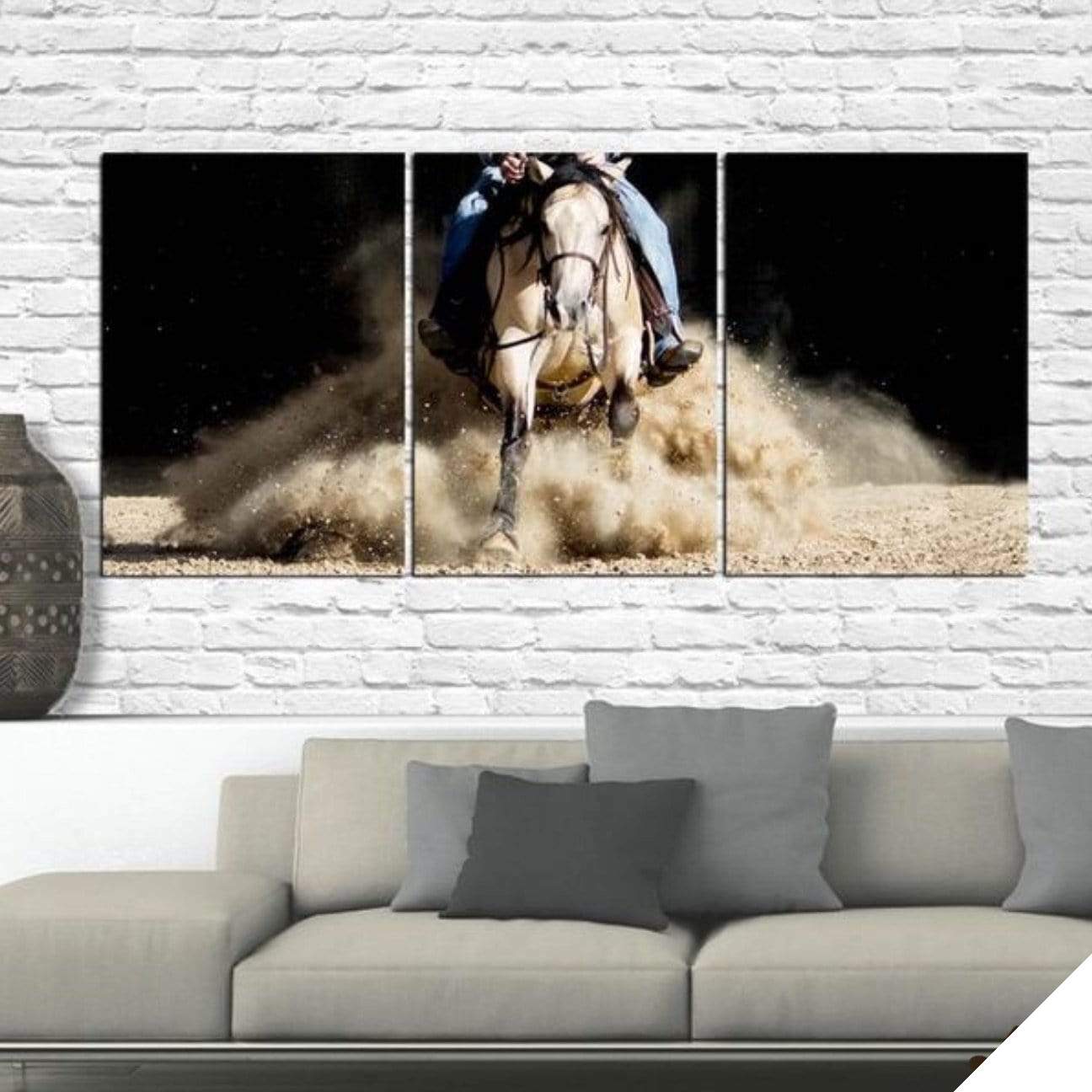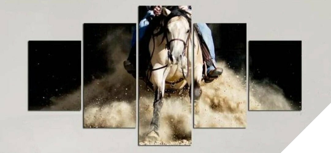 Den här westernmålningen “Cowboy på flykt” betonar styrkan och kraften som hästen utövar under sin flykt. Denna representation öppnar upp för varje persons fantasi om äventyret med den här cowboyn i Amerikas Vilda Västern.