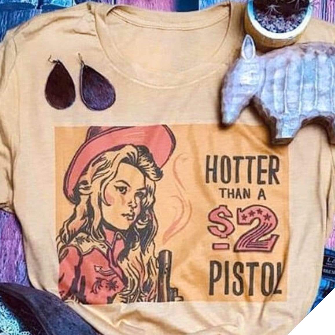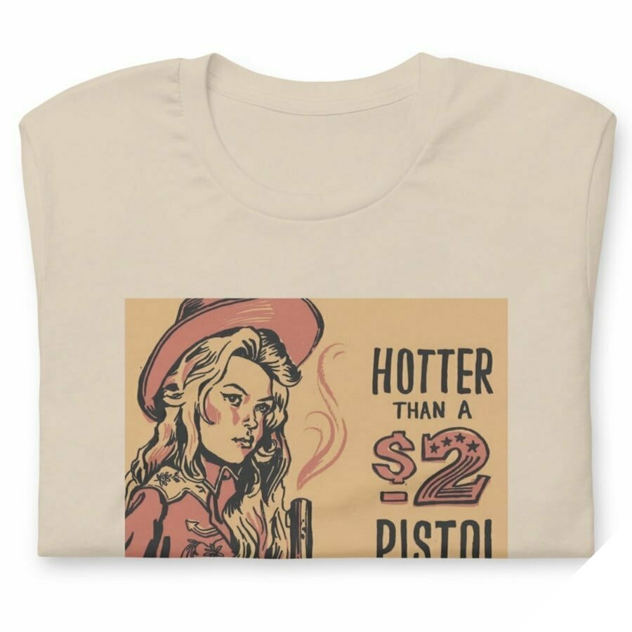 T-shirtet Hettare Än en 2-dollarare i westernstil framhäver en konstnärlig och humoristisk syn på vilda västern. Mönstret framhäver en cowgirl i erövringen av vilda västern. Ett t-shirt för countryälskare och glada människor.