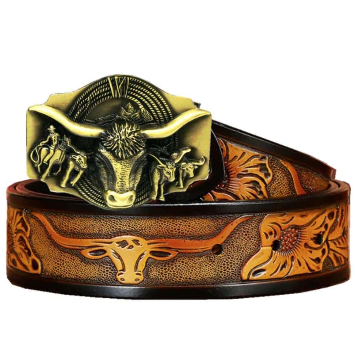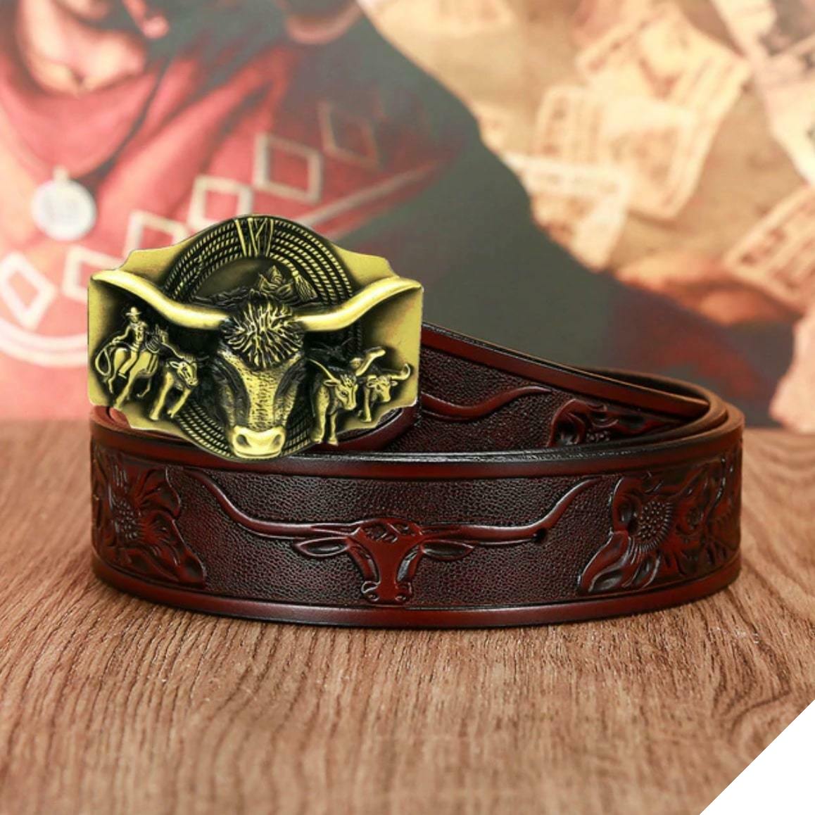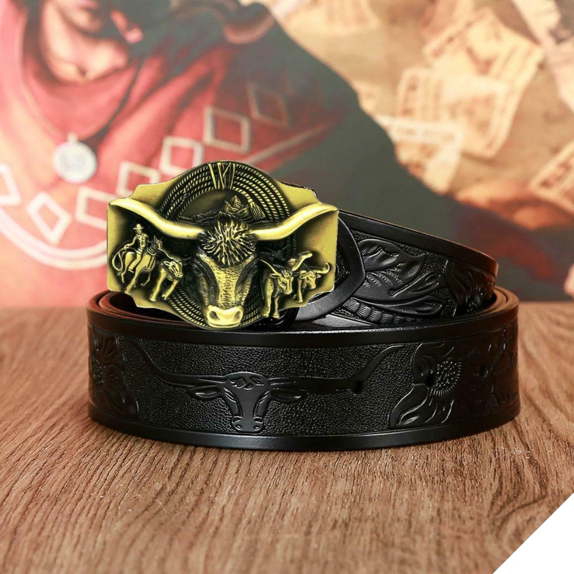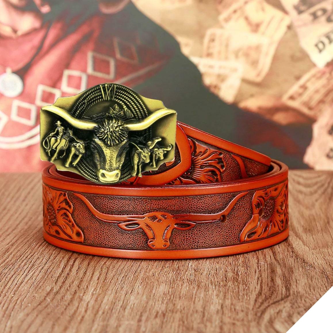 Detta westernbälte för herrjeans har en unik och elegant design inspirerad av en av de symboler från Far West: tjuren. De detaljerade finisharna påminner om cowboy-världen.