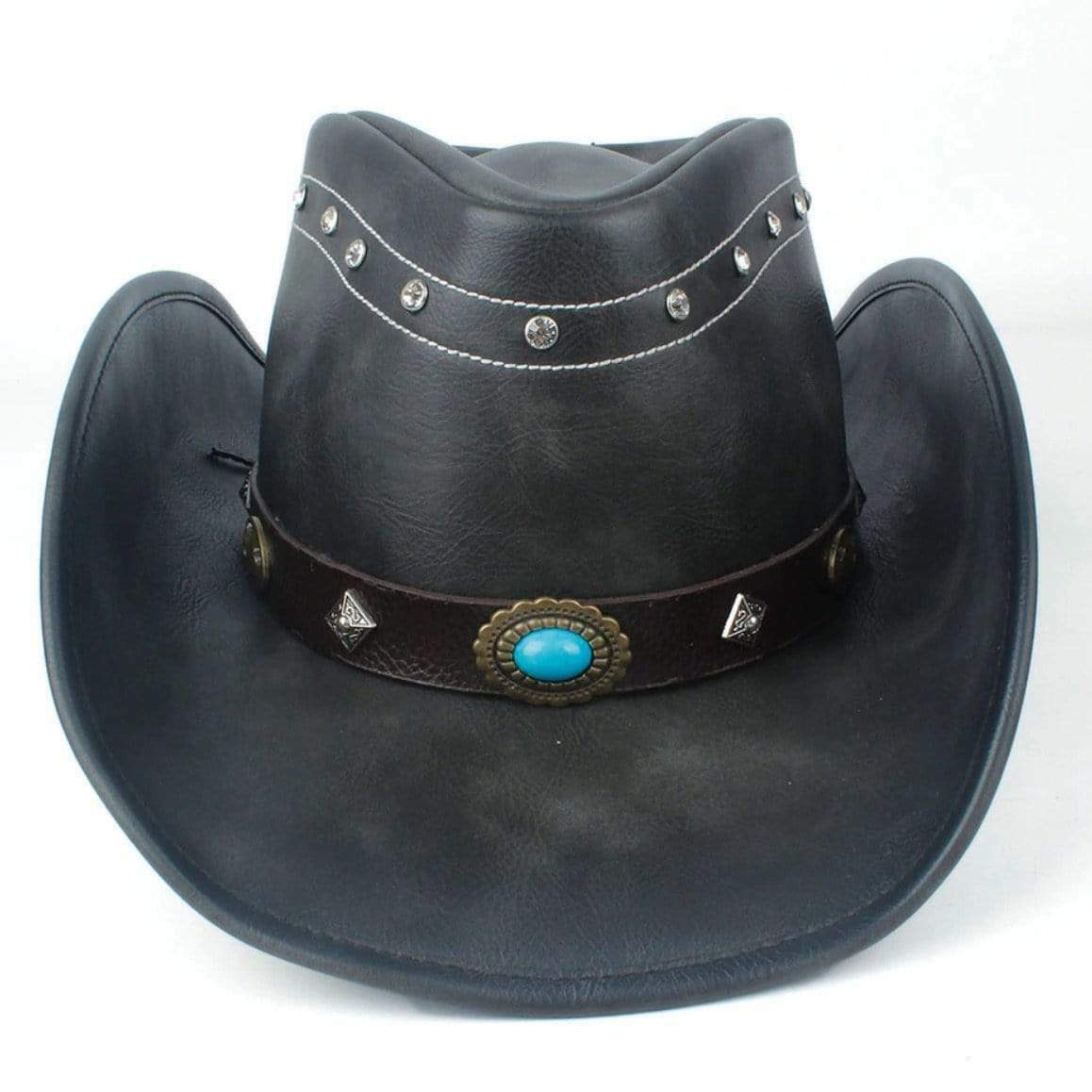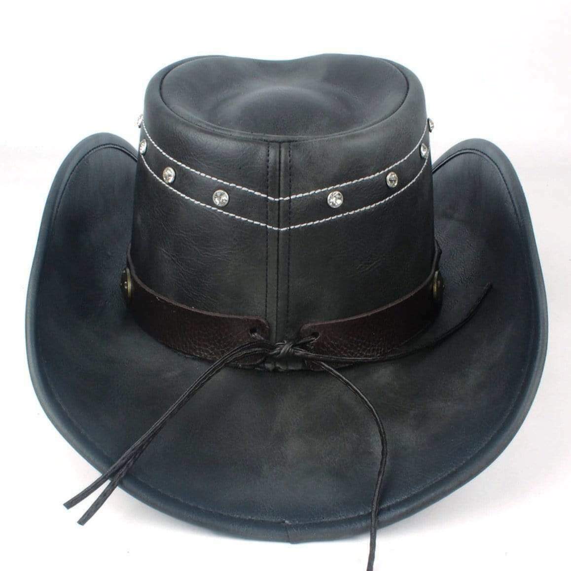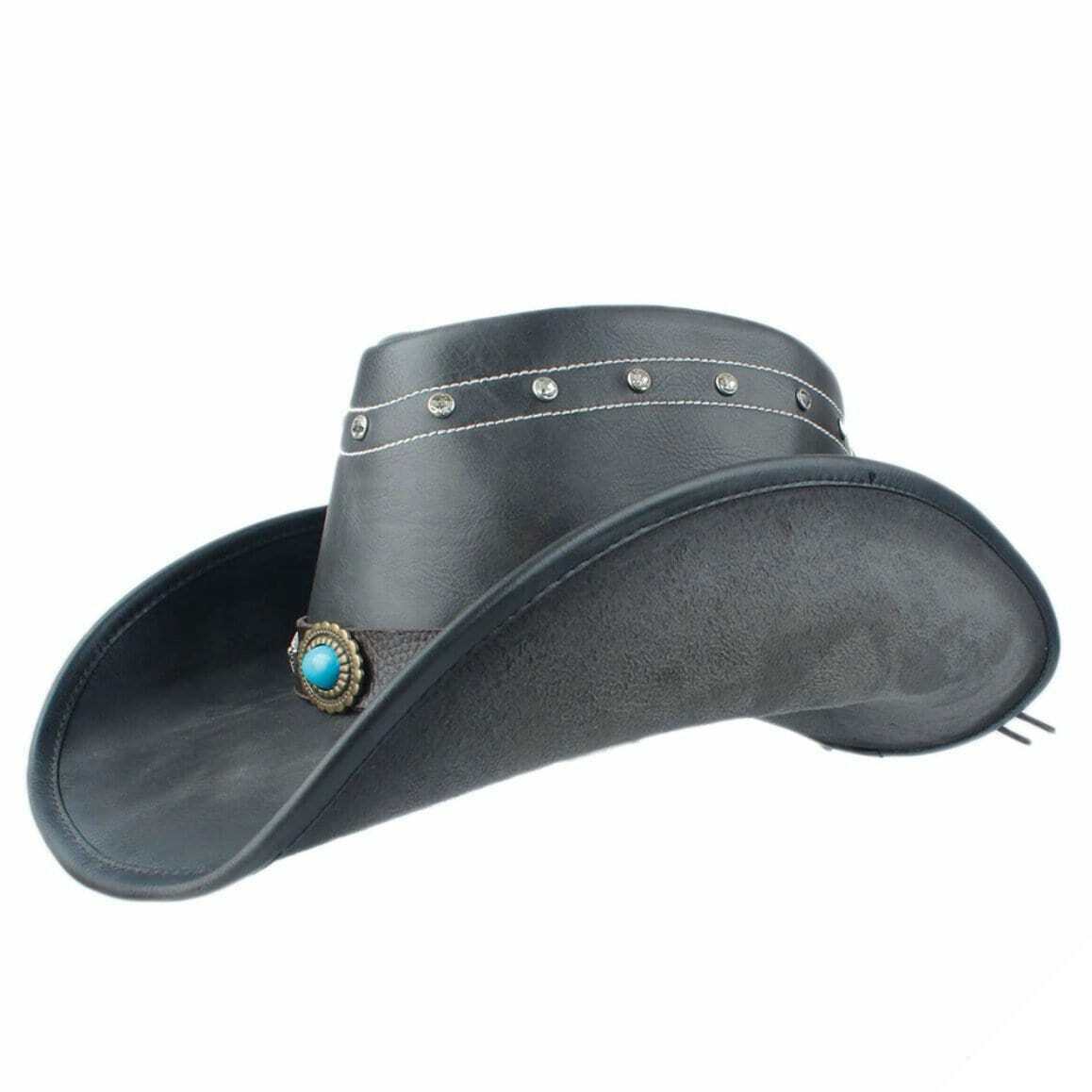 Den svarta läder cowboyhatten är en mytisk klassiker från westernfilmer. Tillverkad av äkta premiumläder är den dekorerad med en rem med symbolen för Vilda Västern. Dess autentiska utseende påminner om några kända scener från westernfilmer.