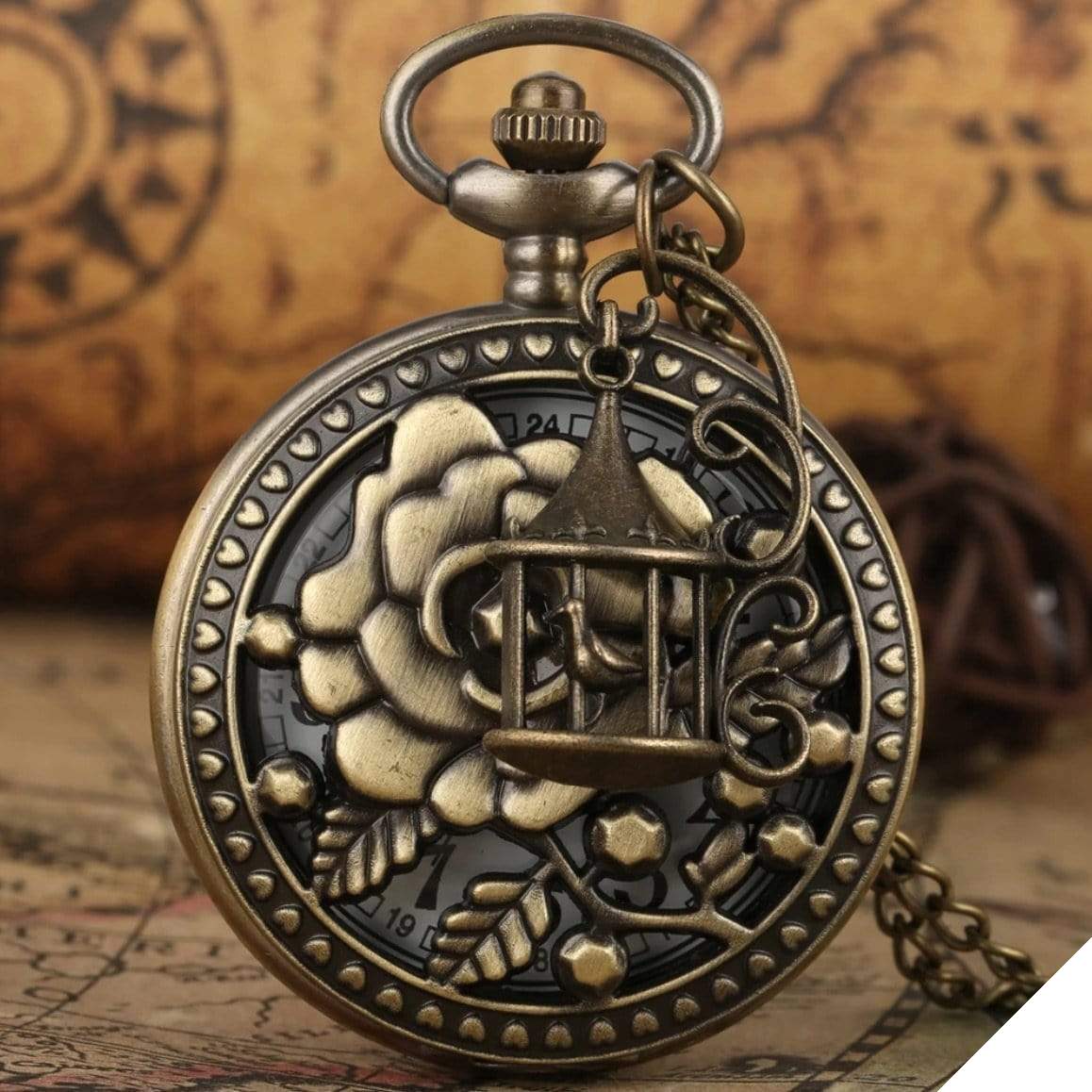 Motiven på denna klocka är en oändlig virvel av fantastiska detaljer. Den har en rosdesign med små hjärtan på locket. Dess krona är prydd med en vacker guldfågelbur och dess skal är försett med en utsirad guilloché. Med sin kedja i guldfärgat utförande är hela klockan en förfogande av mycket ädla metaller. Dessutom har den en emaljerad urtavla med arabiska siffror. En vit urtavla där siffrorna tydligt markeras av visarna.