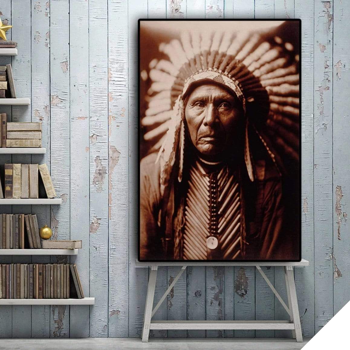 Indianhövdingtavlan erbjuder en representation av en amerikansk indiansk stamhövding. Denna sepia-färgade scen avslöjar många detaljer om apaches traditionella kläder. En extraordinär upplevelse för alla som älskar den amerikanska indianska världen.