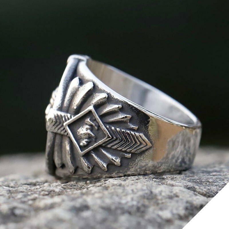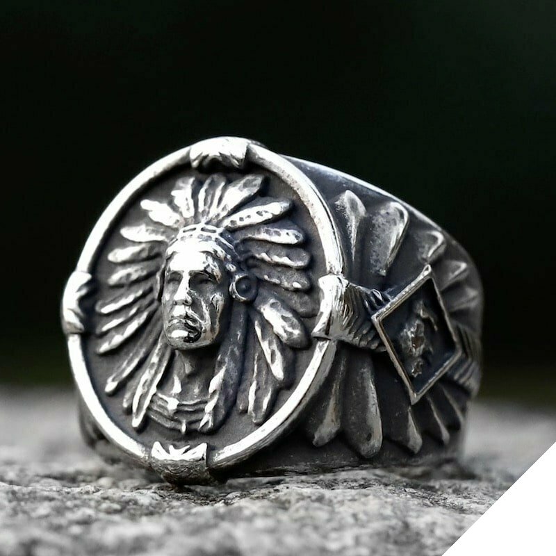 Indianska herrringen är en unik och sofistikerad smycke som representerar den amerikanska apaches kultur. Precisionssnidad och förfinad, smycket är förhöjt med sina realistiska detaljer och guldiga färg, vilket framhäver en Indiernas stamtals ansikte, en klassisk symbol för amerikanska Vilda Västern.