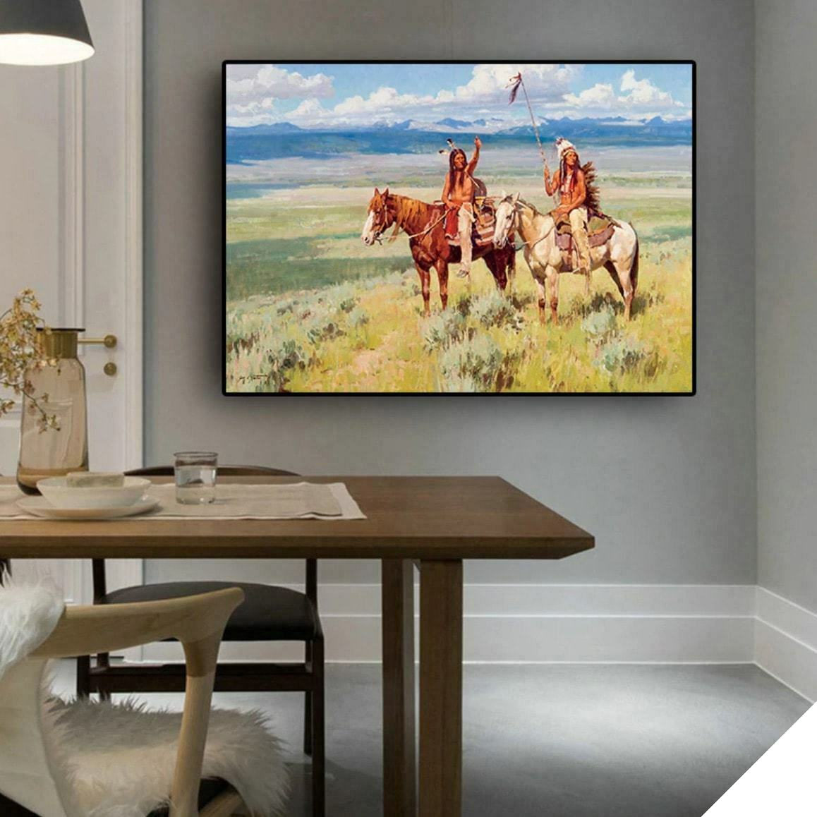 Indian canvas målningen är en representation av indianernas vardag. Denna målning med sina sublima färgspel visar många detaljer och framhäver de berömda amerikanska indianska hästarna, samt deras traditionella klädsel, mitt i de vida amerikanska slätterna.