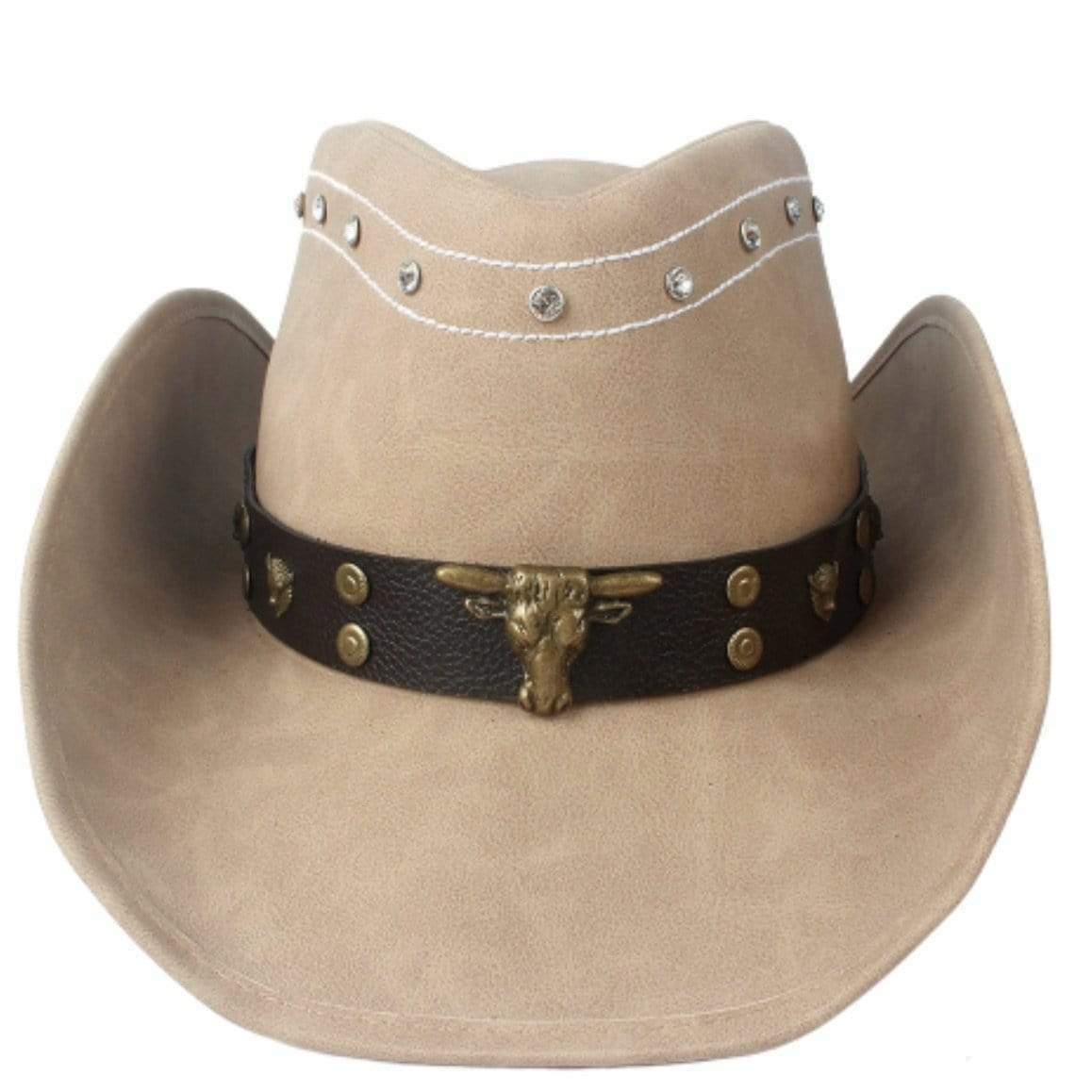 Hatten i Comanchero Western-stil i läder representerar autentiskt Vilda Västern. Dess äkta ljusa läder tillsammans med en banderoll med bisonens kranier, en symbol för cowboy-stil, kommer inte att gå obemärkt förbi för western-entusiaster.
