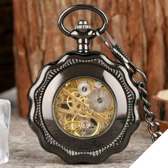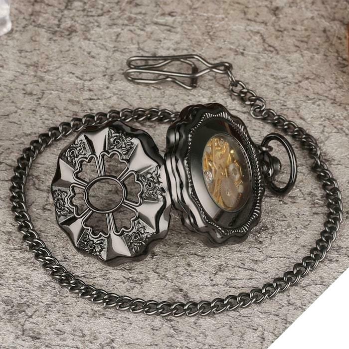 Den manuella pocket klockan är en modell med en oslagbar elegans. Den är designad med en rostfri stålram och utmärker sig genom sin unika form och distinkta detaljer. Med en mekanisk rörelse, låter den sitt hjärta synas för klockälskare att beundra.