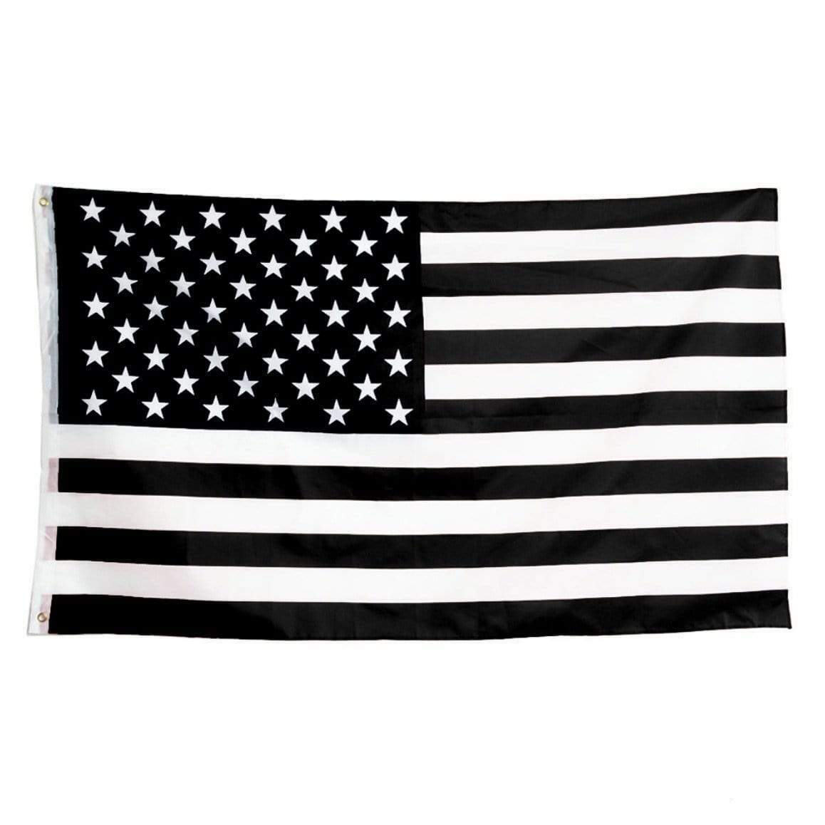 Gjord av slitstark polyester har den svartvita USA-flaggan förstärkta sömmar och dubbelvikta kanter. Dess metallöglor möjliggör enkel upphängning.
