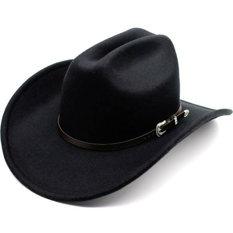 Den svarta westernhatten för herr är en klassisk modell som är oskiljbar från cowboy-stilen. Den är tillverkad av högkvalitativ filt av ull och har ett flätat läderband.