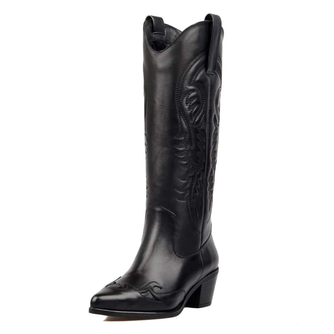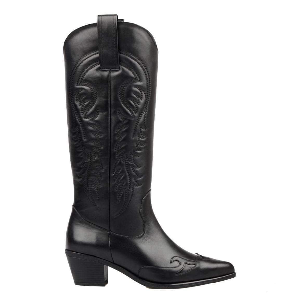 De svarta westernstövlarna för damer uttrycker elegant och karaktäristiskt country-stil. Handtillverkade i äkta högkvalitativt läder, utmärker de sig genom sitt bearbetade läder och sina karaktäristiska mönster.