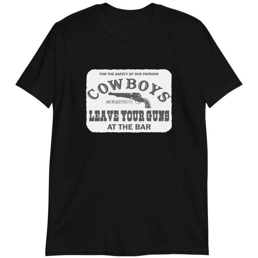 Texten “<em>For the safety of our patrons, cowboys are requested to l</em><span>eave your guns at the bar</span>” kommer att lyfta fram din passion för cowboytidens värld.