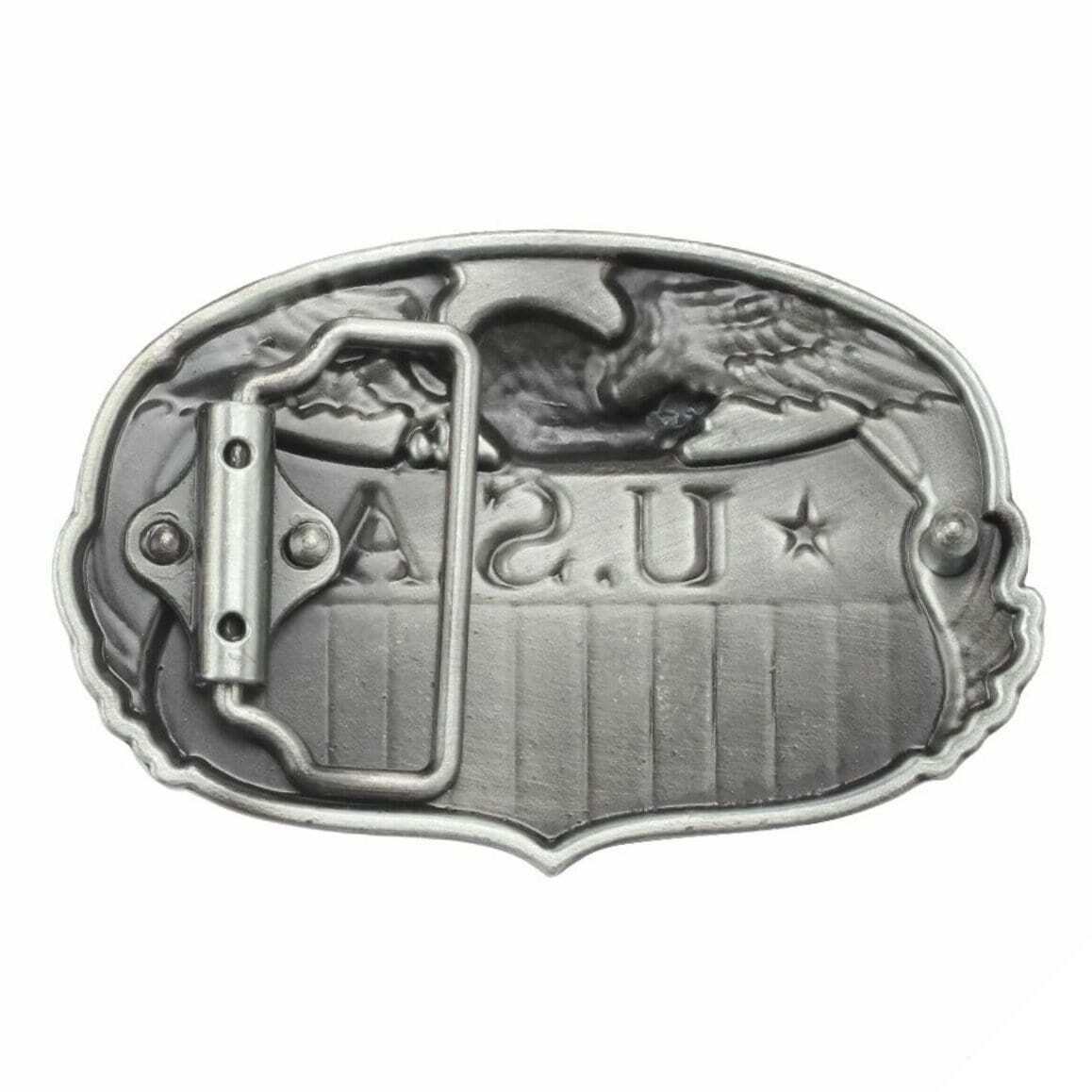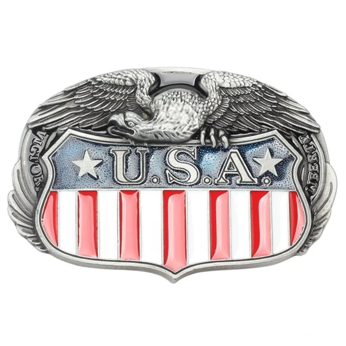 Western USA bältespännet representerar finess i symbolerna för Förenta Staterna. Med den stolta örnen pryder den Stars and Stripes-flaggan med autentiska färger. En perfekt spänne för cowboy-entusiaster.