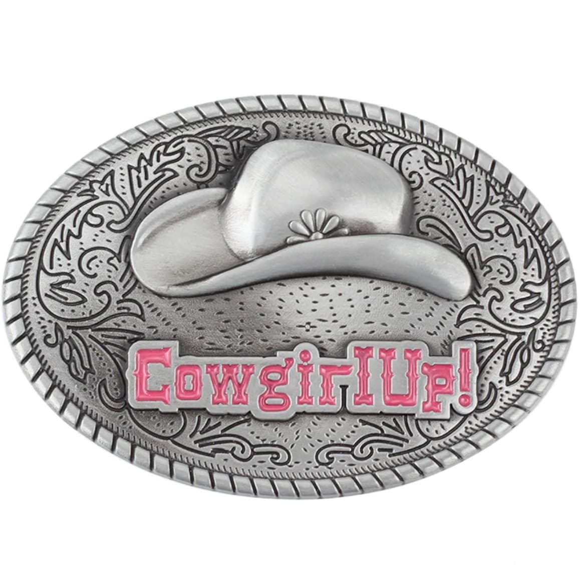 Västern Cowgirl Up belt buckle kommer definitivt att glädja alla hästälskare. Dess unika och detaljerade motiv av cowboyhatt påminner om den vilda västern och cowgirlernas värld.