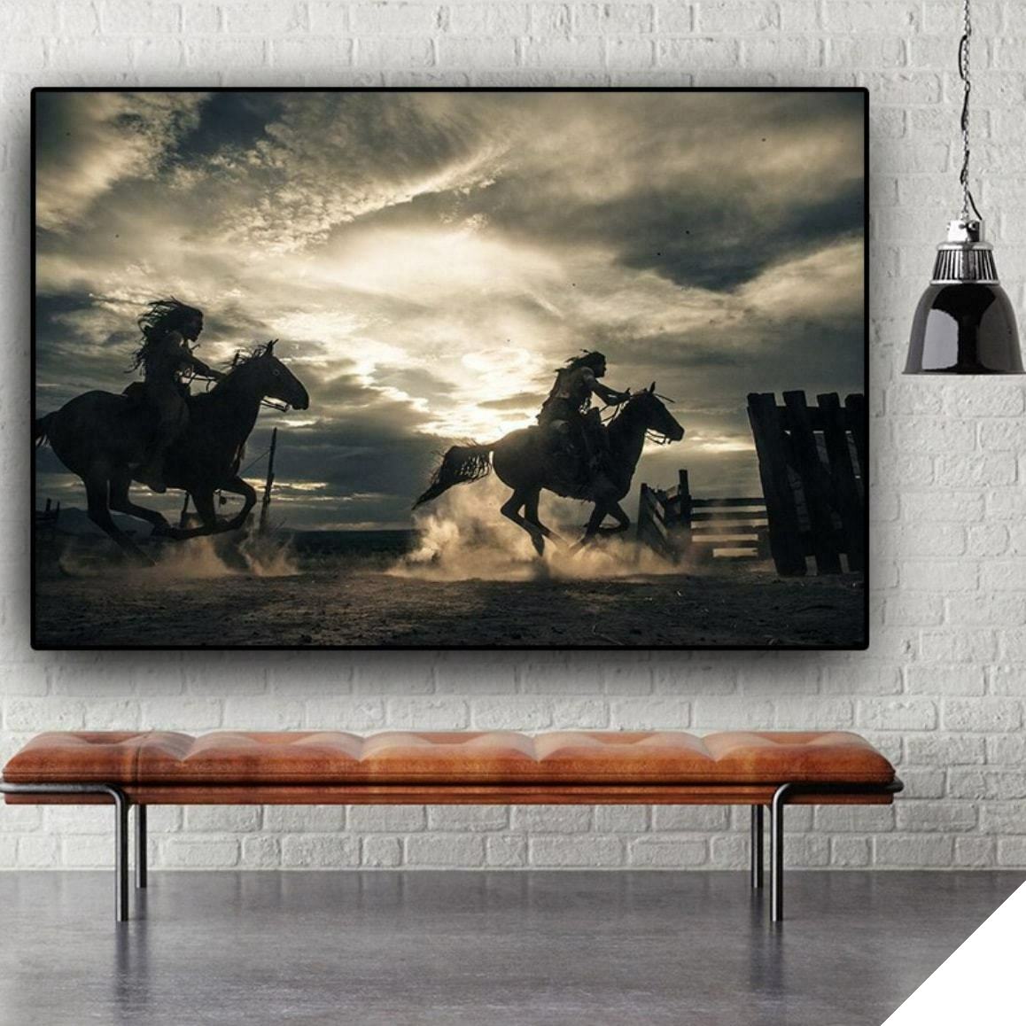 Indisk hästtavla erbjuder en fantastisk representation av en amerikansk-indiansk krigsscen. Denna målning framhäver på ett subtilt sätt den tuffa och vilda världen i Vilda Västern.