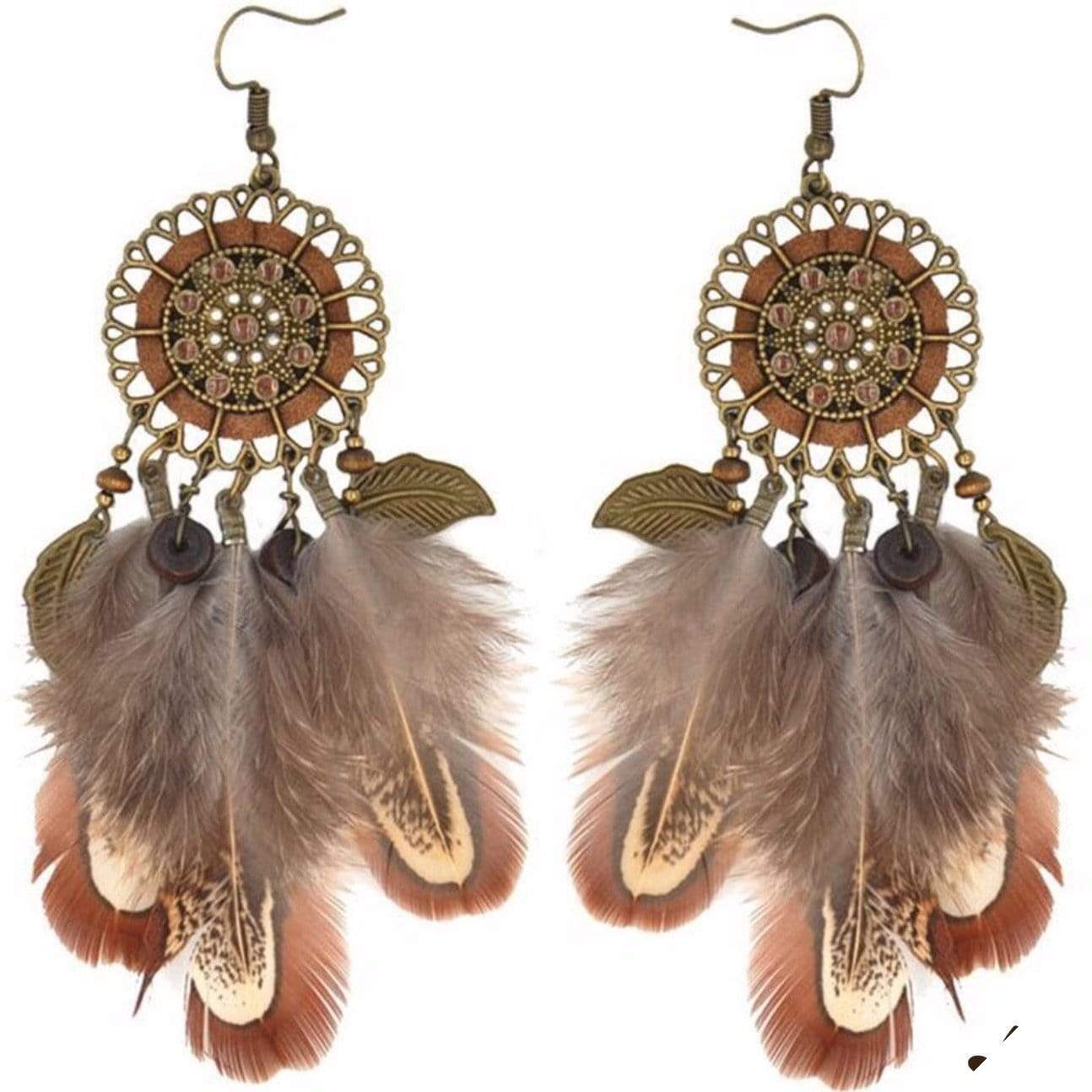 Perfekt för festivalsäsongen, bär detta par hängande örhängen fram bruna fjädrar som är hängda på mönstrade ringar, vilket skapar en drömlikeffekt.