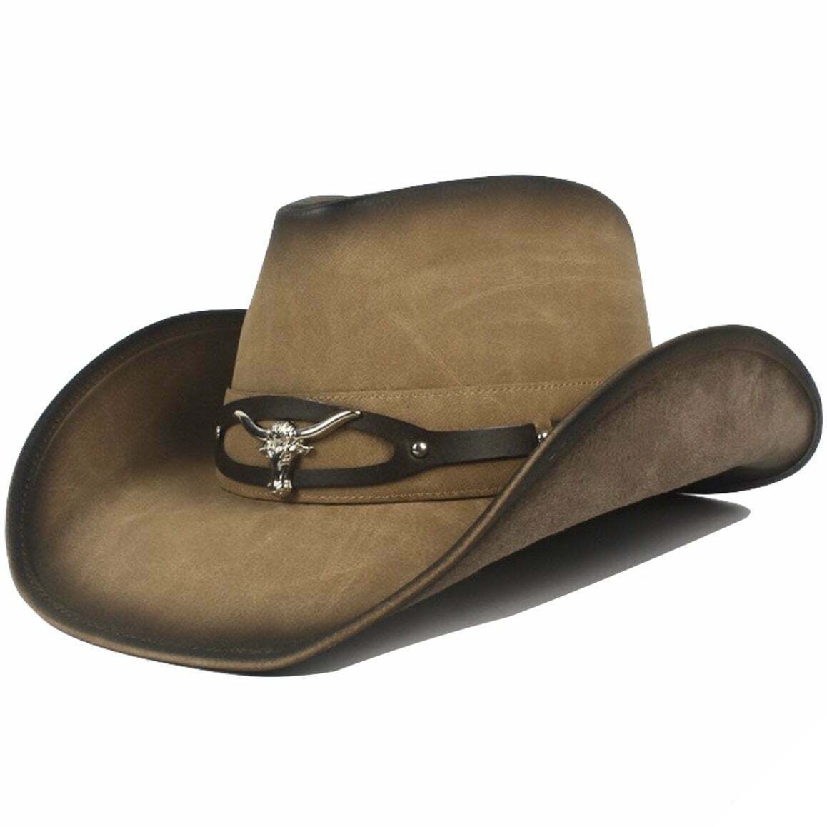 Ridning Western Hatten erbjuder en cowboy-stil som förenar stil och elegans. Tillverkad av äkta högkvalitativt läder, utmärker den sig genom sin vintagefärg och sitt remband med en bisonbuffel-skalle. En hatt som kommer att glädja entusiaster av Vilda Västern.