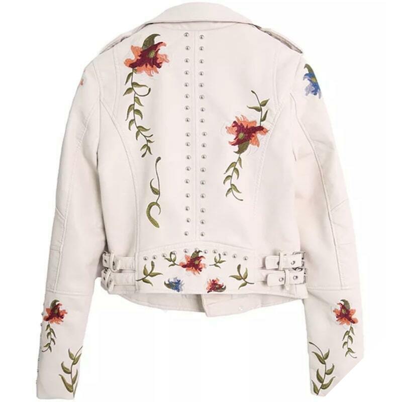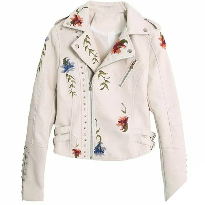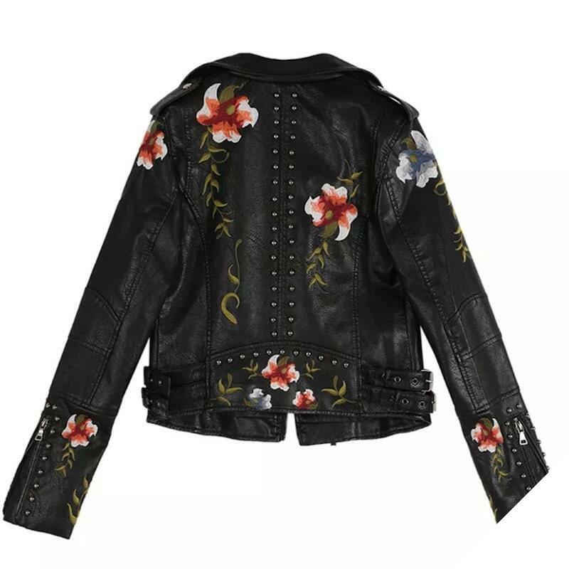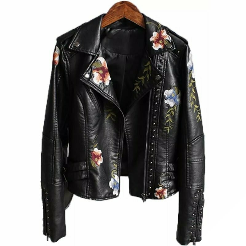 Den korta countryjackan för kvinnor är en unik och originell design med en oefterhärmlig västerntouch. Tillverkad i vegansk läder har den feminina blomsterbroderi som ger en imponerande och elegant look.